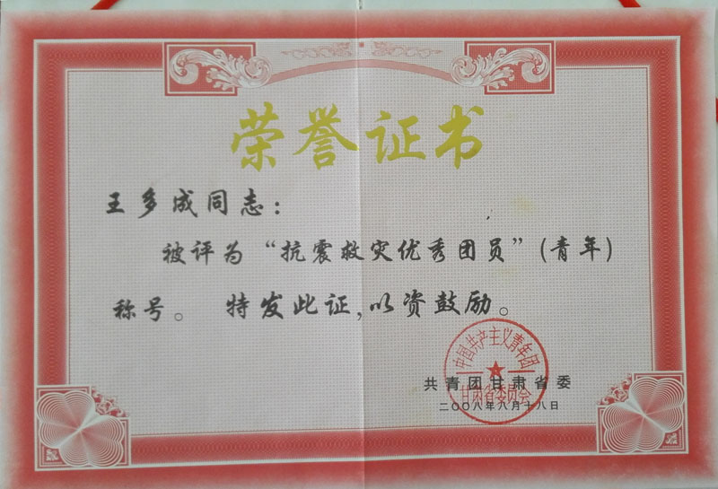 2008年榮獲抗震救災(zāi)優(yōu)秀青年稱號(hào)榮譽(yù)證書 | ||