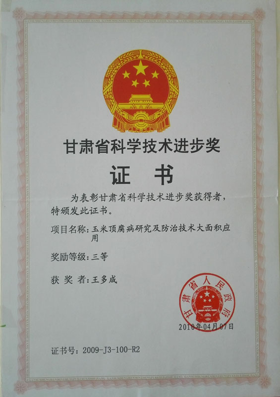 2010年榮獲甘肅省科學(xué)技術(shù)進步三等獎證書